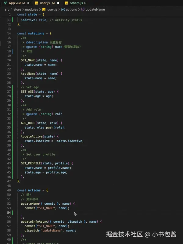user.js)中编写 Action 时,commit和dispatch的代码补全会自动过滤并仅显示当前模块的内容。