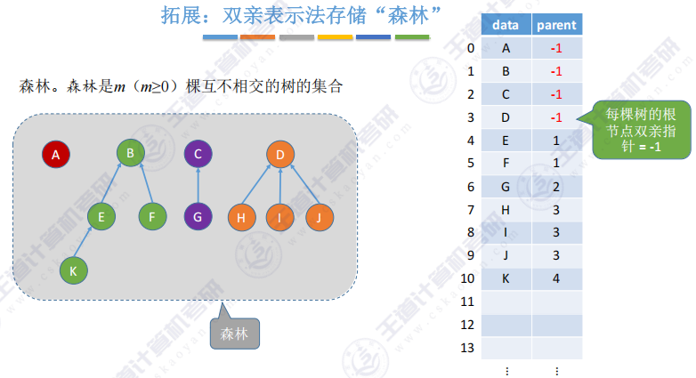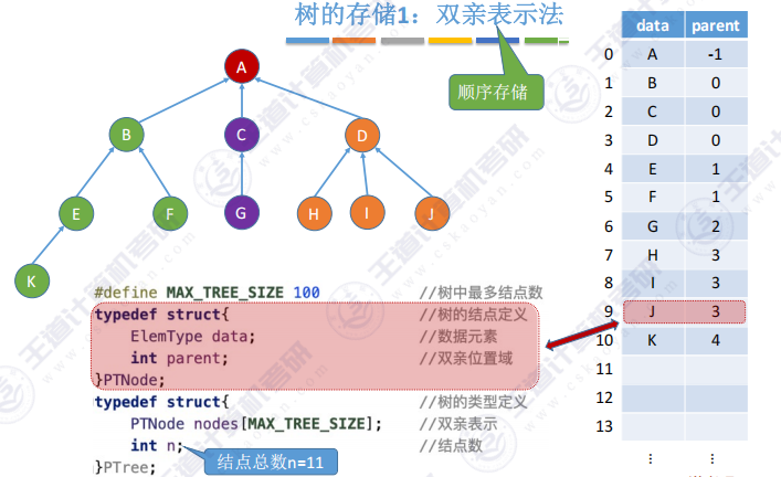 根节点的双亲指针 = -1(如下图"parent"的-1,表示A为根节点)