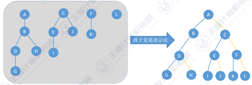 - 转换规则 :"左孩子,右兄弟"。先把所有树的根结点画出来,在二叉树中用右指针串成糖葫芦 ,再按"森林的层序"依次处理每个结点。