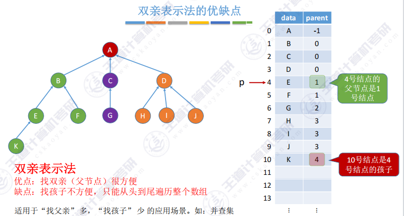 非根节点的双亲指针 = 父节点在数组中的下标 (如下图的"parent"的1,表示E的父节点是B,B的数组下标为1)