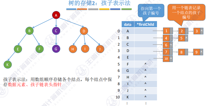 - 孩子表示法:用数组顺序存储各个结点。每个结点中保存数据元素、孩子链表头指针