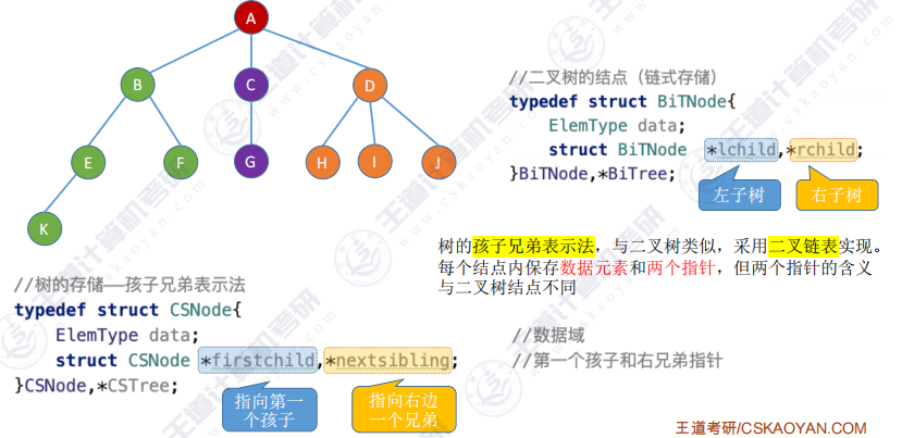 - 孩子兄弟表示法 :与二叉树类似,采用二叉链表实现。每个结点内保存数据元素 和两个指针 ,但两个指针的含义与二叉树结点不同