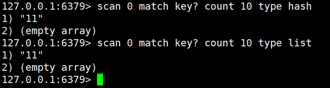 可以看到即使我们指定了 count 为 10,它也不一定返回 10 个。此外,scan 的返回值先分成了两部分,第二部分继续分,这就是遍历返回的 key,第一部分就是继续下一次 scan 所要在参数中加的光标,可以看到这个光标也不是连续的,这里给的 11,但是无所谓,我们不可理解 Redis 理解就行,我们加在下一次 scan 中,可以看到,果然完成了全部指定条件 key 的遍历。这里还有一点要注意,就是因为 scan 有好几个可选参数,所以我们使用可选参数时得在前面加标识,不然每个都可能省略,Redis 就没法识别参数到底啥意思。