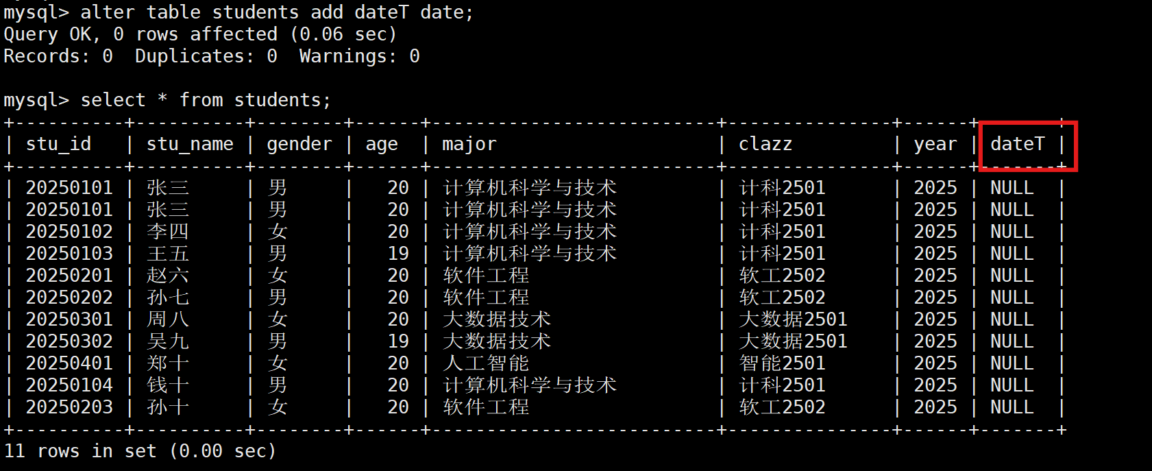 alter table 表名 add dateT date;