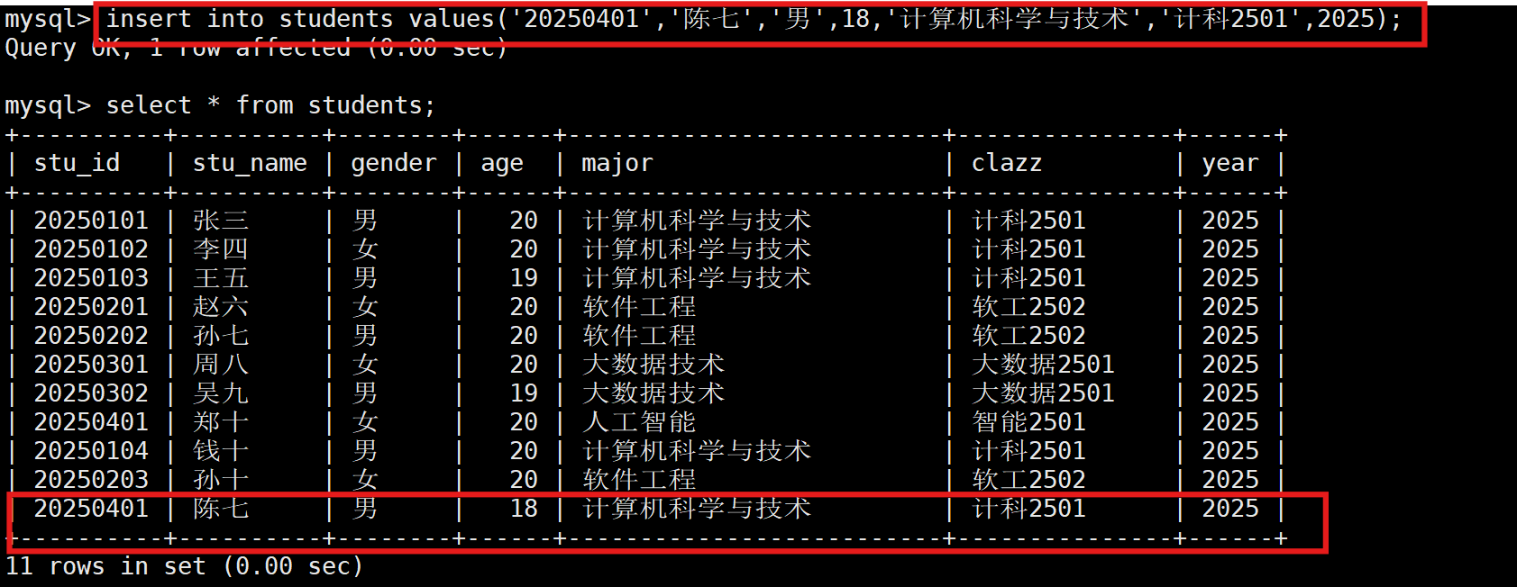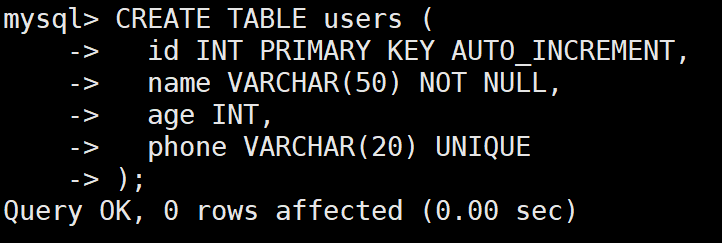 INSERT INTO 表名 (name, age, phone) VALUES ('张三', 25, '13800138000');