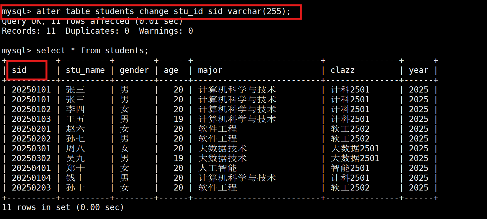 alter table 表名 change stu_id sid varchar(255);