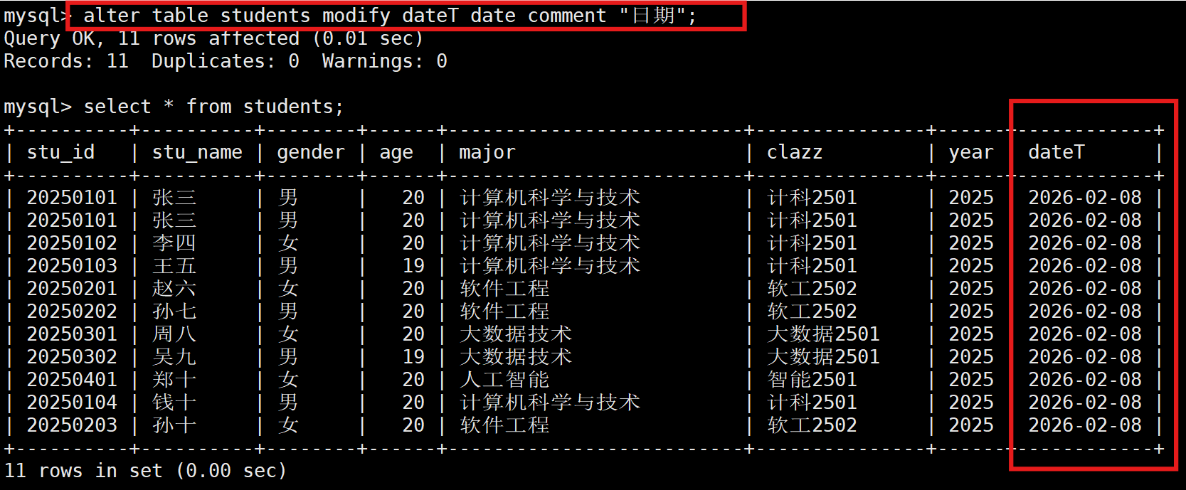 alter table 表名 modify dateT date comment "日期";