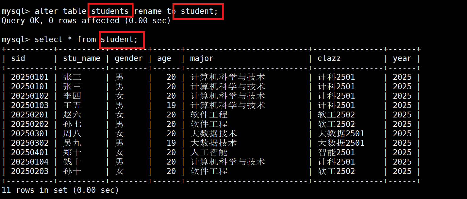 -- 修改表名
