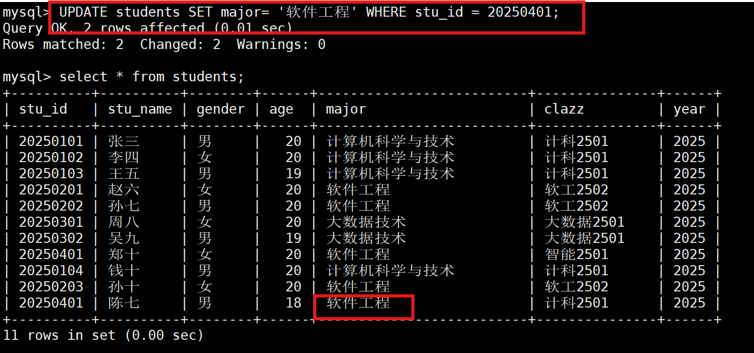 UPDATE 表名 SET major= '软件工程' WHERE id = 1;
