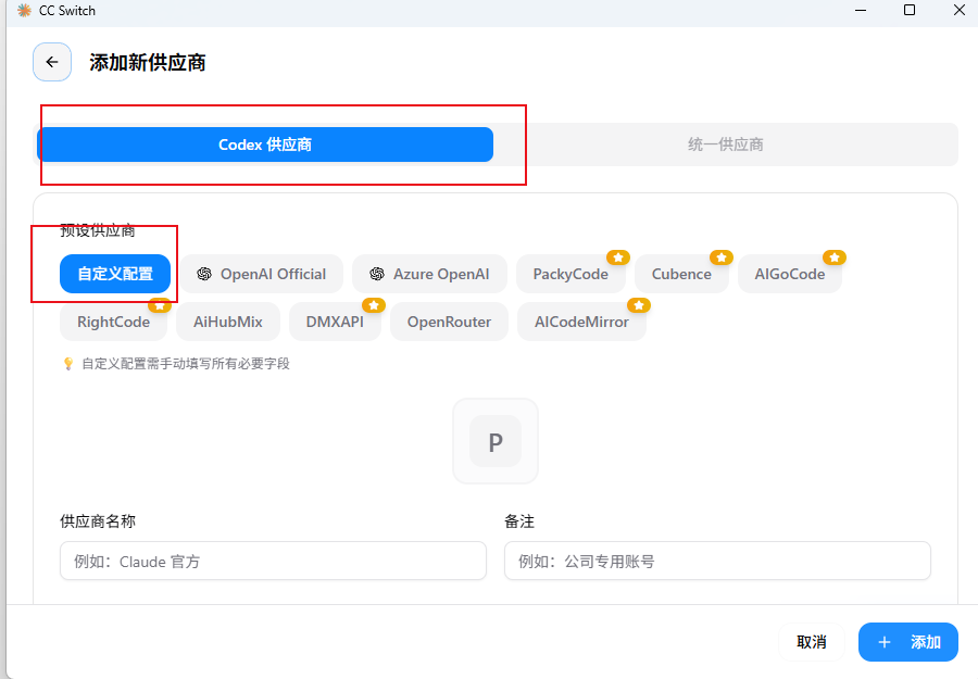 - 打开 CC-Switch → 进入 Codex → 点「+」新增配置