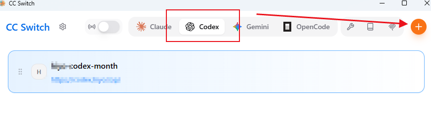 在 CC-Switch 中找到 Codex 入口,点击进入后,再点击「+」新增配置:
