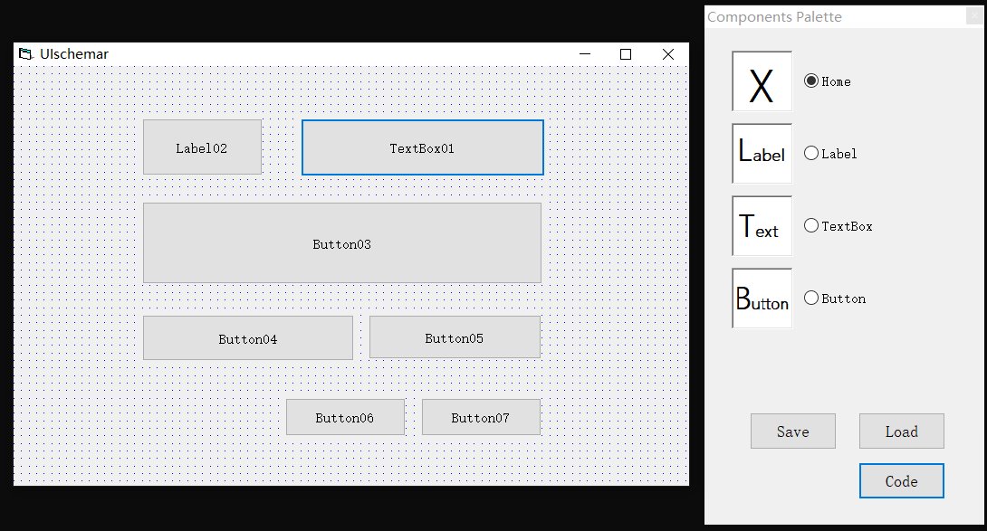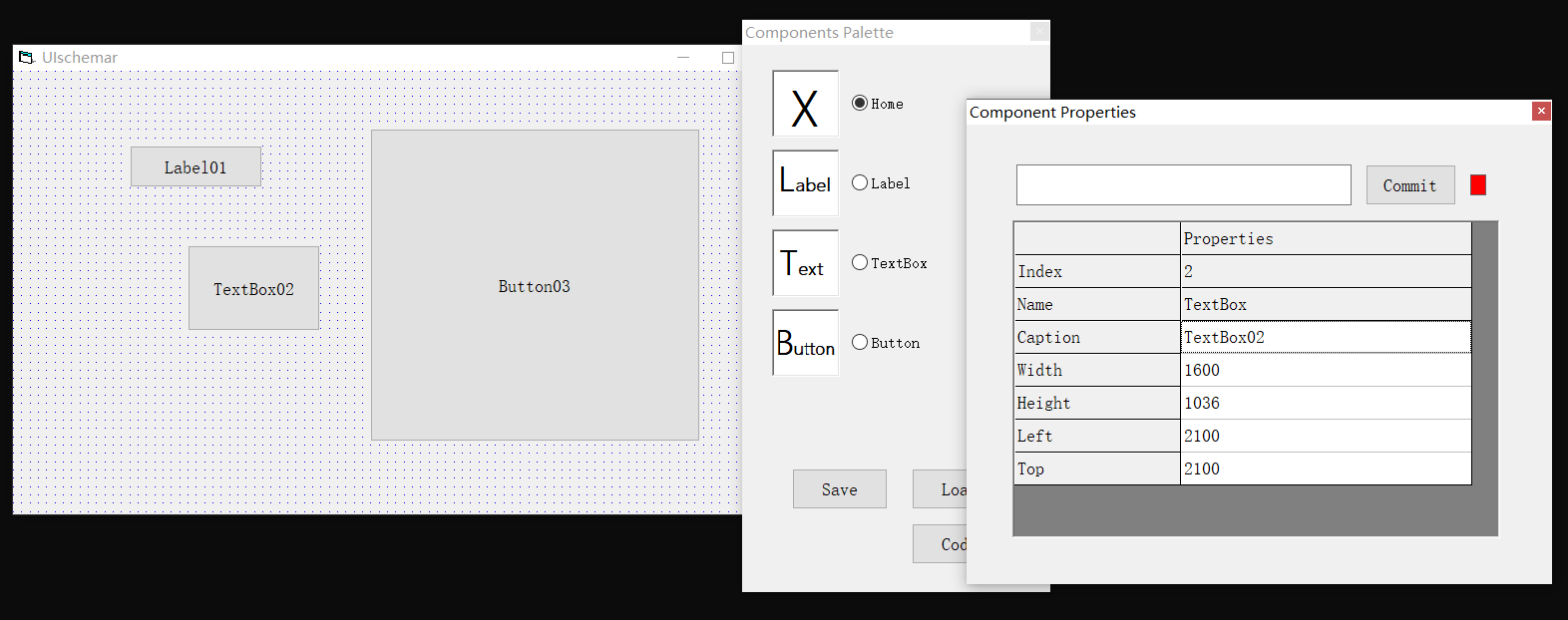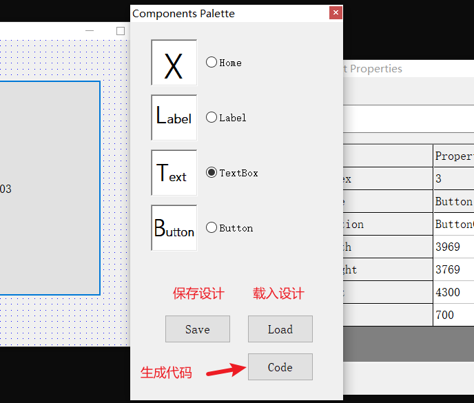 简单地,用VB6把它写成了这个样子。一个设计用的FORM,一个组件的PALTTE,一个属性列表(没有方法和事件列表)。