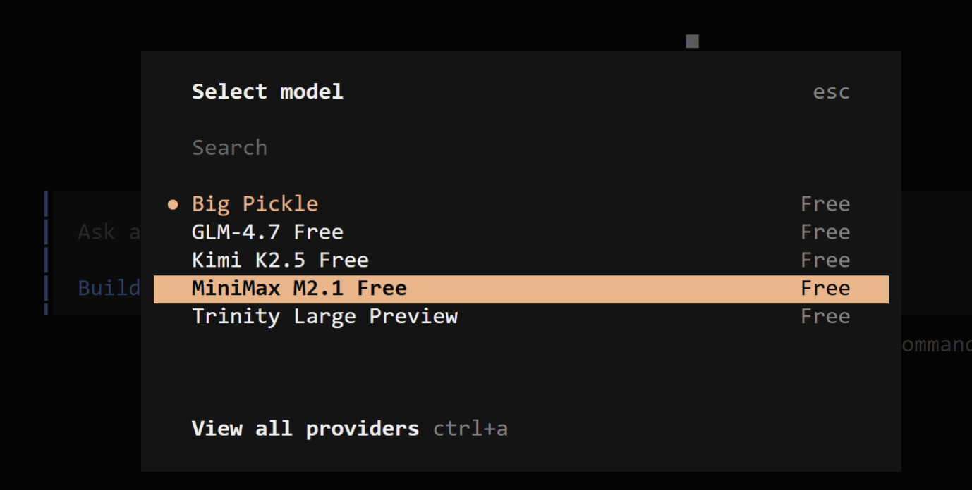 Zen 还提供一组免费模型:Grok Code Fast 1、GLM 4.7、MiniMax M2.1、Big Pickle 和 GPT 5 Nano。"免费入门 + 按需付费"的模式降低了准入门槛,适合预算有限的独立开发者、高校实验室和中小企业。