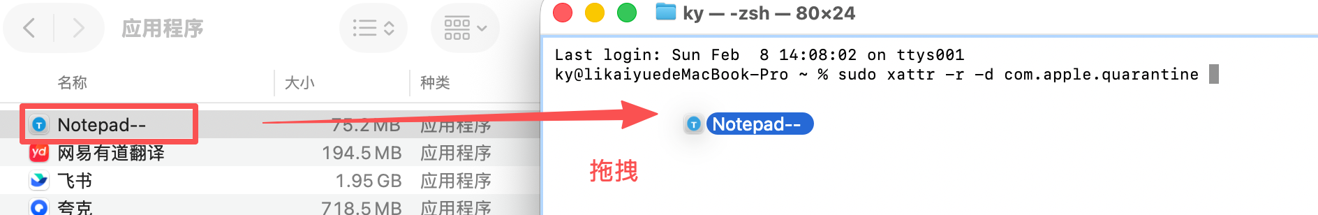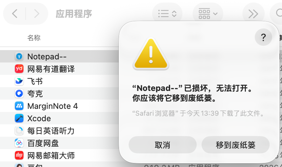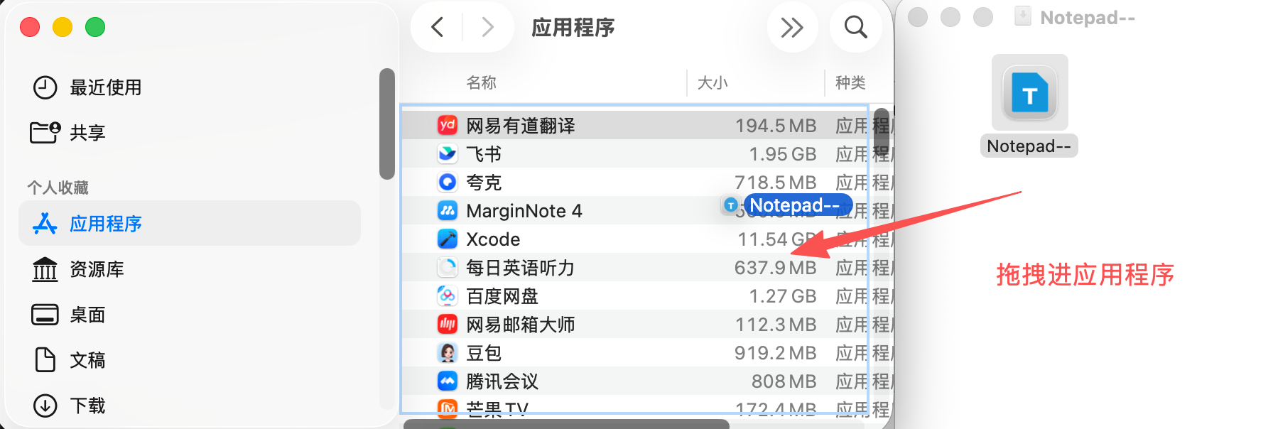 首先安装时,打开访达-找到应用程序,然后将Nodepad--直接拖进应用程序,这样就安装成功了。