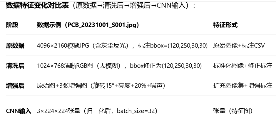 原始数据包括PCB板高清图像(产线摄像头采集)、缺陷标注(人工标注工具生成)、设备参数(贴片机日志),存储于数据湖(MinIO),含噪声(灰尘/反光)、尺寸不一、标注缺失等问题。