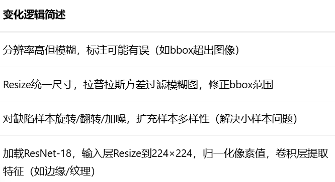 - 数据增强:针对小样本缺陷(如虚焊样本少),采用旋转(±15°)、水平翻转、亮度调整(±20%)、高斯噪声(σ=0.01)扩充样本
