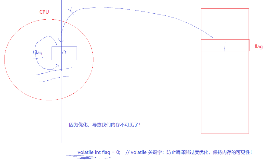 :CPU有自动优化,正常来说flag=1,在虚拟内存地址栈更改了,但是cpu有寄存器,它会保存上下文,也就是保存了flag=0,下次寻找时没有去栈寻找,直接拿寄存器的使用了,所以flag确实更改了,但是cpu没去找