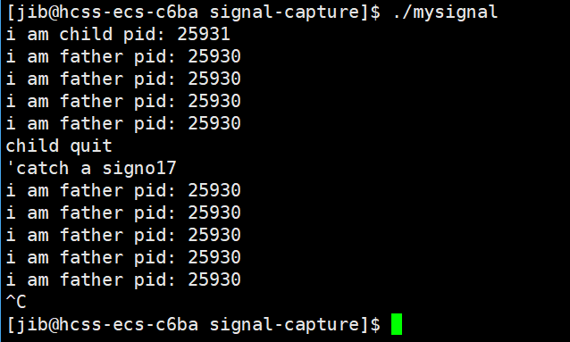 cout<<"catch a signo:"<<signo<<"child quit success"<<endl;