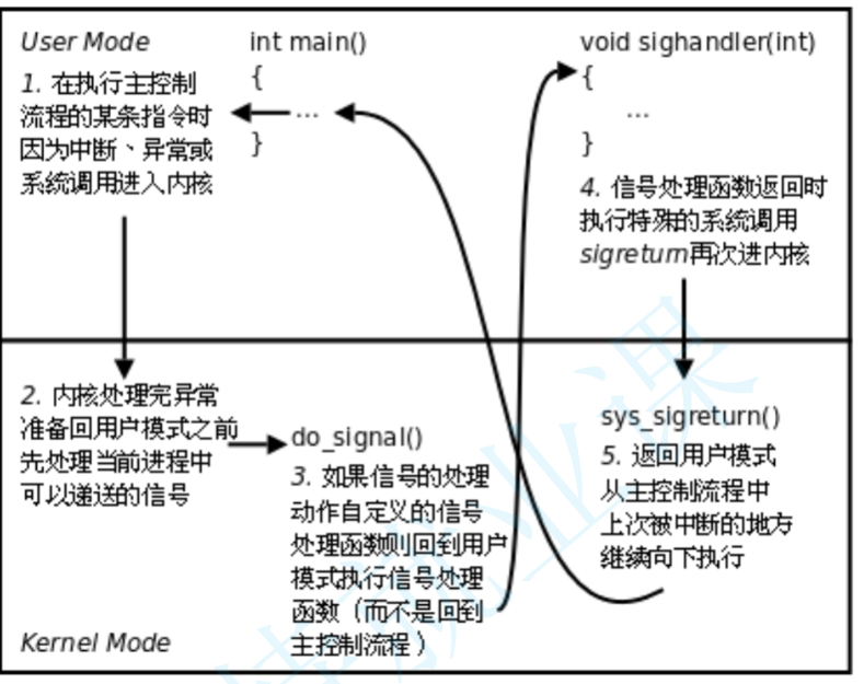 用户态因异常等等产生信号,陷入内核态,检查要处理的信号(匹配handler表),回到用户态处理信号,调用系统调用再回到内核态,返回用户态向下执行代码