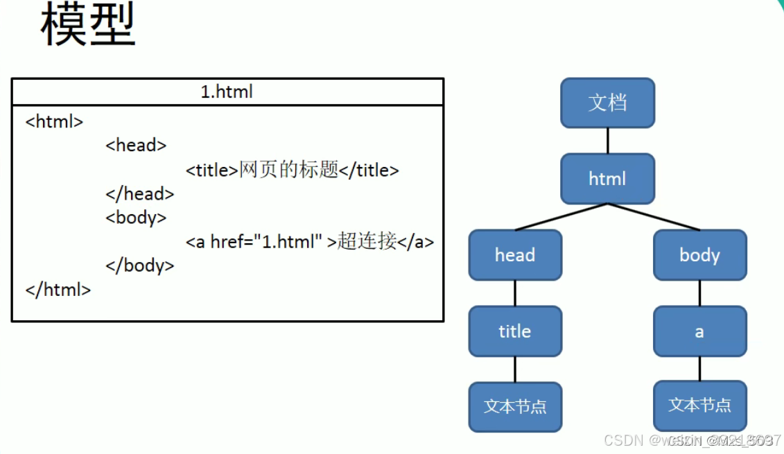 - 文档对象模型,是W3C组织推荐的处理可扩展标记语言的标准编程接口,通过DOM提供的接口可以对页面上的各种元素进行操作(大小、位置、颜色等)。