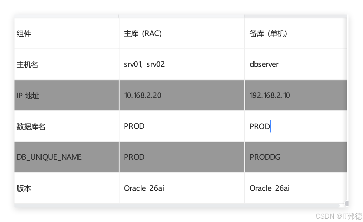 oracle@primary \~\]$ pwd /home/oracle \[oracle@primary \~\]$ scp pfile_prod_new.ora 192.168.2.10:/home/oracle 利用新建的实例创建pfile,然后修改 SQL\> create pfile from spfile; 备库参数: vi /home/oracle/initPROD.ora *.__oracle_base='/opt/oracle'#ORACLE_BASE set from environment *.__pga_aggregate_target=1644167168 *.__sga_target=4898947072 *.compatible='23.6.0' *.control_files='/u01/oracle/oradata/PROD/control01.ctl','/u01/oracle/oradata/PROD/control02.ctl' *.db_block_size=8192 *.db_unique_name='PRODDG' *.db_name='PROD' *.service_names='PROD' *.log_archive_config='dg_config=(PROD,PRODDG)' *.LOG_ARCHIVE_DEST_1='LOCATION=/u01/oracle/oradata/arch VALID_FOR=(ALL_LOGFILES,ALL_ROLES) DB_UNIQUE_NAME=PRODDG' *.LOG_ARCHIVE_DEST_2='SERVICE=prod_pd LGWR ASYNC VALID_FOR=(ONLINE_LOGFILES,PRIMARY_ROLE) DB_UNIQUE_NAME=PROD' *.diagnostic_dest='/opt/oracle' *.dispatchers='(PROTOCOL=TCP) (SERVICE=ORCLCDBXDB)' *.enable_pluggable_database=true *.FAL_CLIENT='prod_st' *.FAL_SERVER='prod_pd' *.standby_file_management=AUTO *.nls_language='AMERICAN' *.nls_territory='AMERICA' *.open_cursors=300 *.pga_aggregate_target=1554m *.processes=640 *.remote_login_passwordfile='EXCLUSIVE' *.sga_target=4660m *.undo_tablespace='UNDOTBS1' *.db_create_file_dest='/u01/oracle/oradata/PROD' *.db_create_online_log_dest_1='/u01/oracle/oradata/PROD' ### 6.3 备库创建目录 mkdir -p /u01/oracle/oradata/PROD mkdir -p /u01/oracle/oradata/arch 备库使用spfile启动库 sqlplus / as sysdba startup pfile='/home/oracle/initPROD.ora' nomount; 创建pifle后重新启库 create spfile from pfile='/home/oracle/initPROD.ora'; shutdown immediate; startup nomount;  ## 7.创建dataguard数据库 备库RMAN登陆,做以下操作 rman target sys/oracle@prod_pd AUXILIARY sys/oracle@prod_st RMAN> run { allocate channel prmy1 type disk; allocate channel prmy2 type disk; allocate channel prmy3 type disk; allocate channel prmy4 type disk; allocate channel prmy5 type disk; allocate channel prmy6 type disk; allocate auxiliary channel aux1 type disk; allocate auxiliary channel aux2 type disk; allocate auxiliary channel aux3 type disk; allocate auxiliary channel aux4 type disk; allocate auxiliary channel aux5 type disk; allocate auxiliary channel aux6 type disk; duplicate target database for standby from active database dorecover nofilenamecheck; }  ## 8.主备 SwitchOver 切换 ### 8.1 主切换到备 这个过程留意alert日志,然后关闭实例2,去备库确认切换信息 SQL\> alter database commit to switchover to physical standby with session shutdown; ### 8.2. 备库切换主库 SQL\> alter database commit to switchover to primary with session shutdown; ### 8.3 启动主备库 --打开新的主库 alter database open; select name,open_mode,database_role from v$database; 打开新的备库: srvctl start db -d PROD alter database recover managed standby database using current logfile disconnect from session; select name,open_mode,database_role from gv$database;