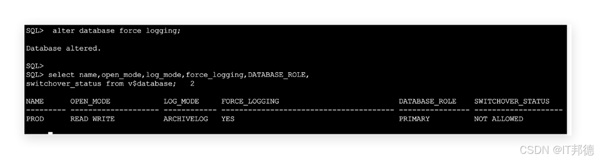 SQL> select name,open_mode,log_mode,force_logging,DATABASE_ROLE,