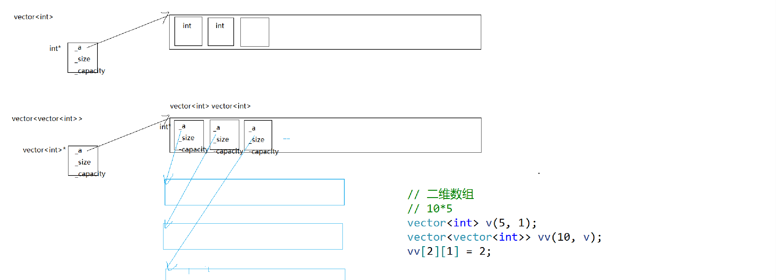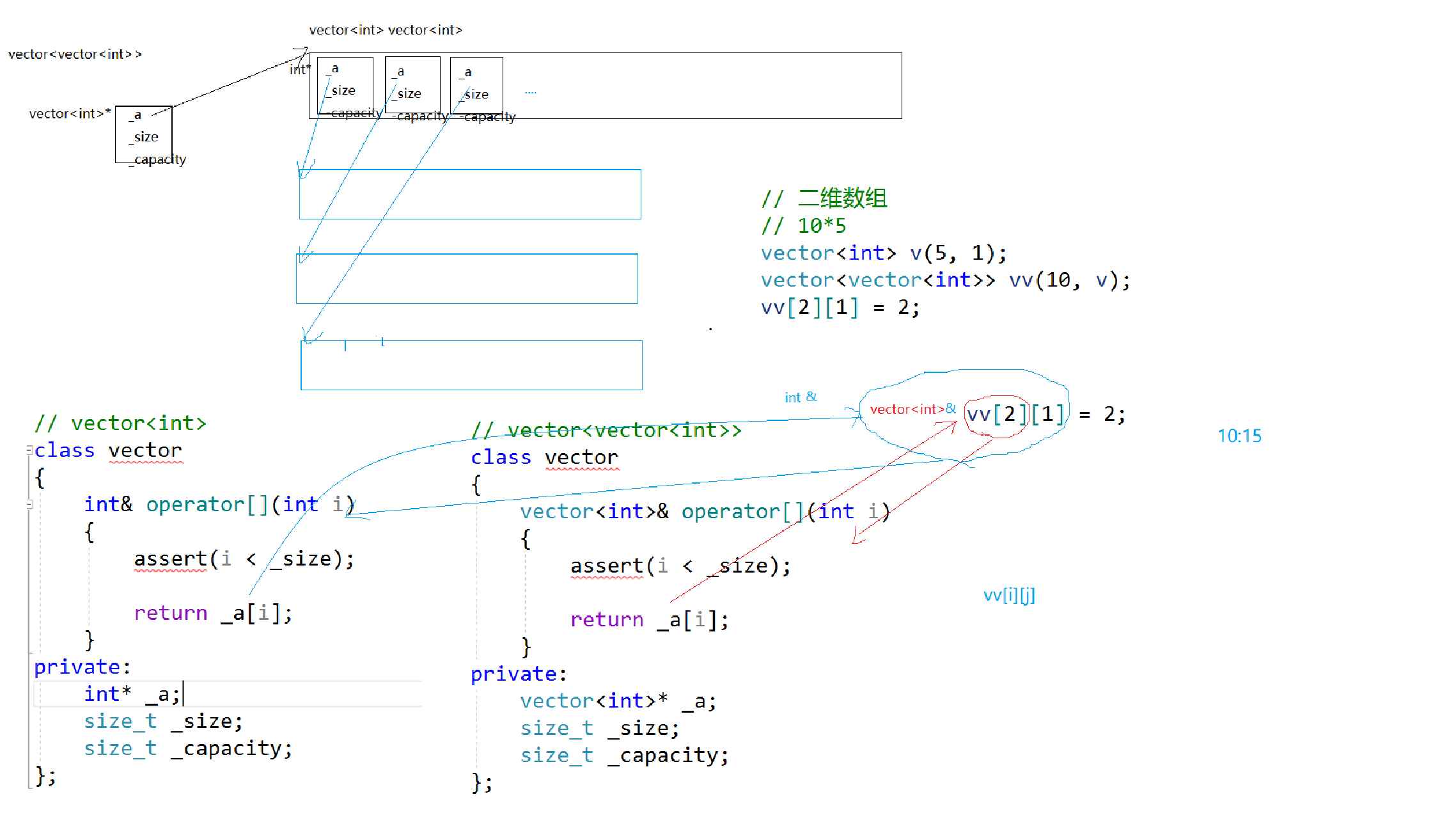 其实内部是由两个类完成的,当我们VV[2][1]的时候,先访问Vector的vector,再访问vector <int> ,这点和二维数组一样的。
