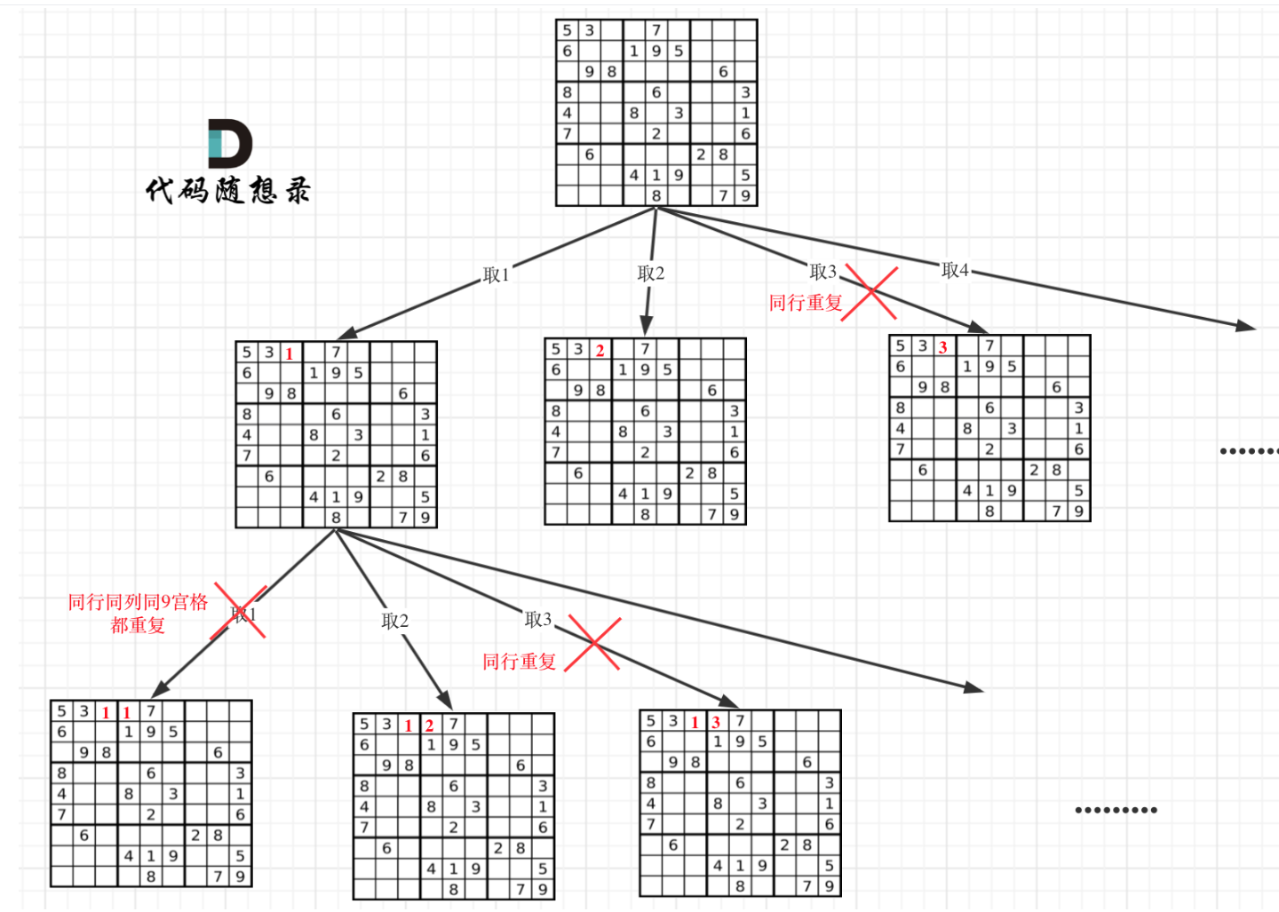 彻底失败:如果 1-9 都试了,这个空白格都填不了,说明上一个空白格填的数错了,回到上一个格换数;