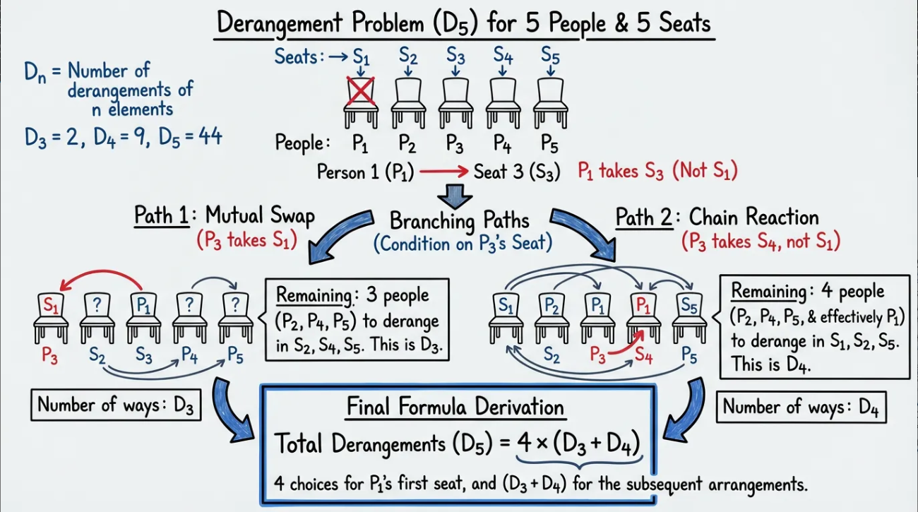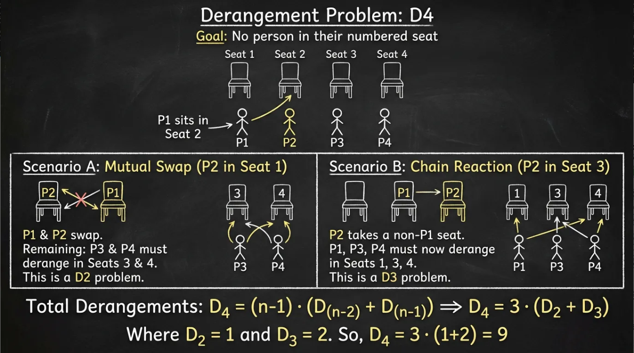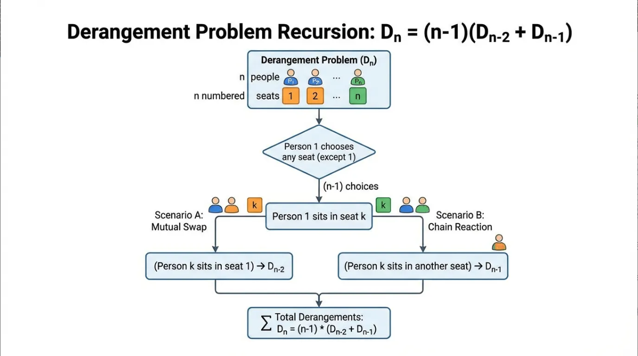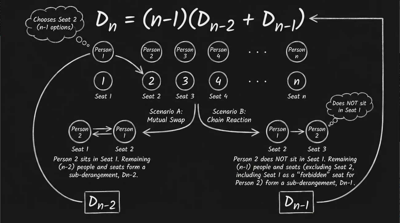 如下图所示,展示第一个人选择座位的两种情况,以及对应的递推关系 Dn = (n-1)(Dn-2 + Dn-1)。