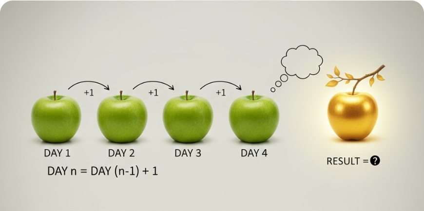 比如我今天吃一个苹果,明天吃两个苹果,每天多吃一个苹果,那第n天我肯定是吃n个苹果。