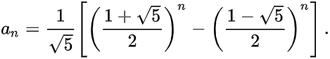 这个时候问题n的答案并不是能够那么简单推出来的!但是也是可以推出来的,如果你想推出来这个通项公式,可以用设设特征方程 (线性代数教的)的方式或者设母函数(高中数学教的),也可以用其他的更高级的方式,这里就不多说了。这里的答案,实际答案是斐波那契数列的答案,也就是如图所示: