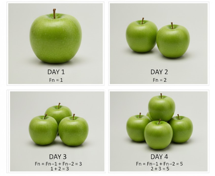 我今天吃一个苹果,明天吃两个苹果,每天吃的苹果是前两天吃的苹果数量之和。