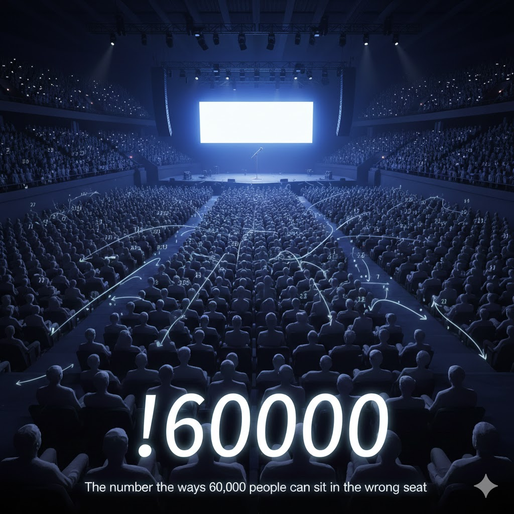 比如周深开一场演唱会,有6万人,因为大家陷入了规则怪谈,所有人都不准坐自己的座位上,必须坐别人的座位上,那么求大家的坐法共有多少种。