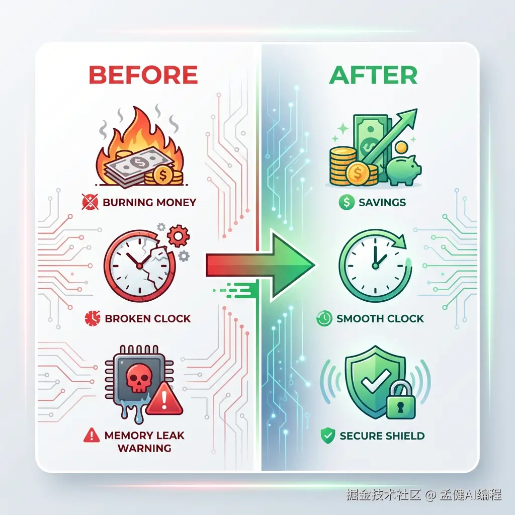 这篇文章记录我怎么排查这个事故,以及趁机把 OpenClaw 2.6 做了一次全面体检------最终 token 费用降了 30-50%,记忆不再丢失。