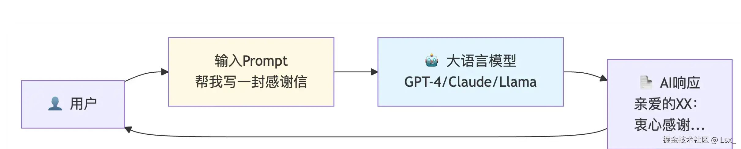 纯Prompt场景是最基础、最直接的AI应用方式,就像使用搜索引擎一样简单:你输入问题(Prompt),AI直接返回答案。示意图如下: