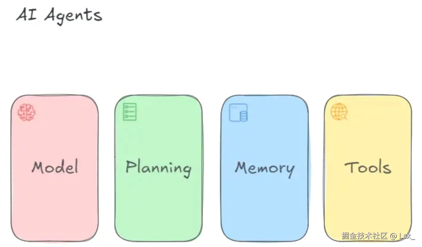 AI Agent = LLM(大脑) + Memory(记忆) + Planning(规划) + Tools(工具)
