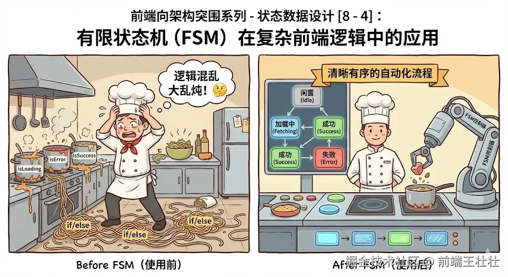 遗憾的是,大部分前端代码都在用"零散的布尔值"来模拟状态,这导致逻辑极难测试,且隐藏着巨大的状态冲突风险。