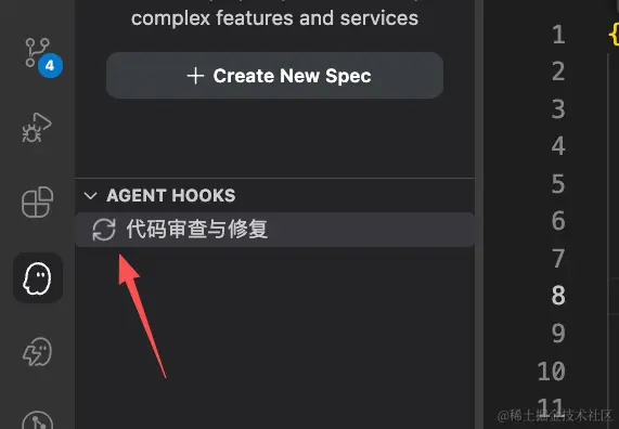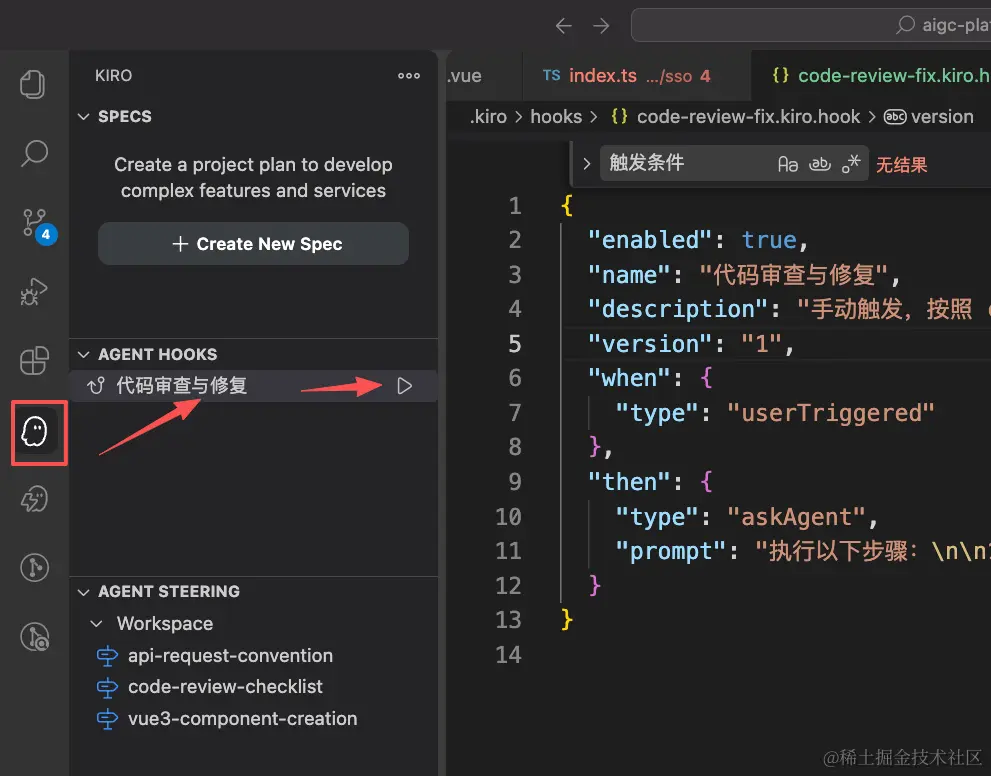 Kiro编辑器的最左侧找到这个方框中的图标,点击后找到你的Hooks列表,在列表里找到你想要执行的hook,点击右侧的执行按钮即可解放双手!