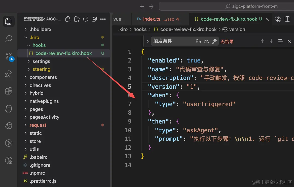 Hook的效果就是:你每次保存.vue或.ts文件,AI会自动读取你改的文件,按照你项目里已有的审查规范检查,发现问题就帮你修。