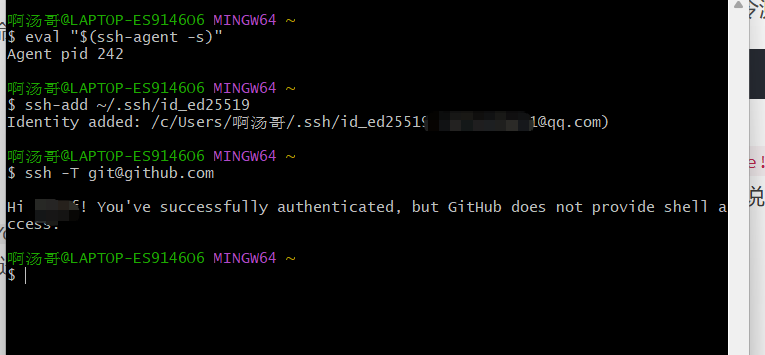 Hi username! You've successfully authenticated...,说明配置成功!现在你可以正常进行代码推送了。
