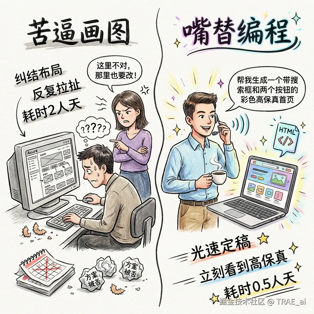 反复拉扯: 拿着线框图向老板、UI、研发解释,"这里以后是彩色的"、"这个按钮点击后会弹出一个框"... 沟通成本高,信息损耗严重。