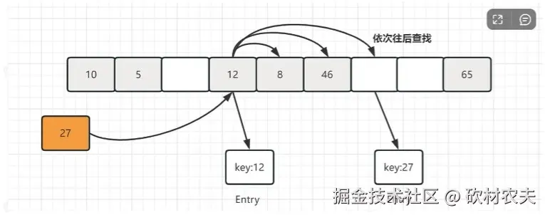 - 当前插入的元素从冲突位置开始依次往后遍历,直到找到一个空闲位置
