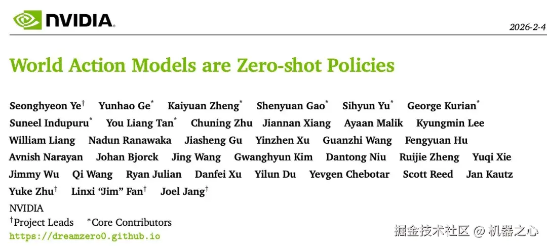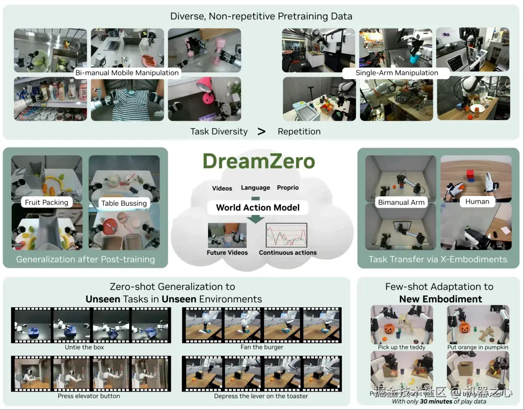 最近,英伟达 GEAR 实验室提出 DreamZero,一种基于预训练视频扩散骨干网络构建的世界动作模型(WAM)。