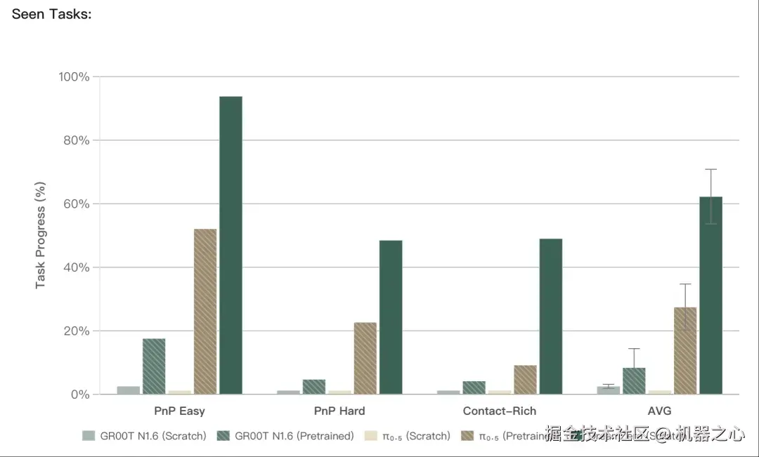 研究团队对预训练模型进行开箱即用评测:任务来自预训练分布,但在未见对象的新环境中进行零样本测试。DreamZero(也包含从零训练版本)取得 62.2% 的平均任务进度,相比最佳预训练 VLA 基线(27.4%)提升 超过 2×。从零训练的 VLA 几乎为零;预训练 VLA 有一定进展,但幅度有限。