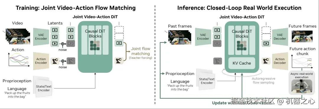 在训练阶段,模型以分块(chunk)的方式工作:在给定干净视频上下文作为条件的情况下,对加噪的视频与动作潜变量进行去噪。在推理阶段,模型的预测会以异步方式在真实世界中执行,同时将真实观测结果回灌到 KV cache 中,以防止误差随时间累积。