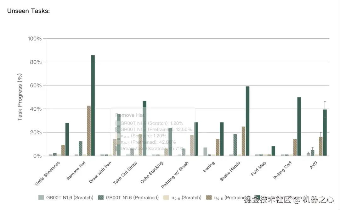 对于训练中完全未出现的任务(如解鞋带、握手),DreamZero 仍达到 39.5% 的任务进度,而 VLA 再次表现吃力。值得注意的是,预训练 VLA 在未见任务上的有限进展,主要源于其无论指令如何都倾向于执行 「抓取 - 放置」 的默认动作,显示其过拟合于主导训练行为,而非真正理解新任务语义。研究团队在 4 台机器人、不同环境与物体上,对每个检查点进行了 80 次 rollouts。