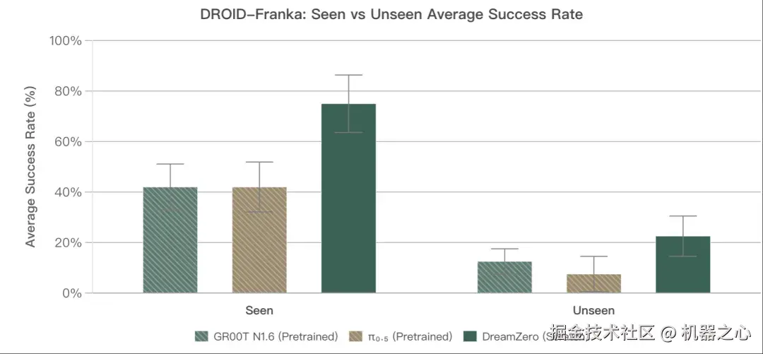 为验证在公开数据上的效果,研究团队在 DROID(最异构的开源机器人数据集之一)上训练 DreamZero,并评测 20 个已见任务与 20 个未见动词任务(DROID 中未出现的动作)。DreamZero 显著优于预训练基线,在未见动词上取得 49% 的任务进度,而最先进的 VLA 仅为 25--32%。