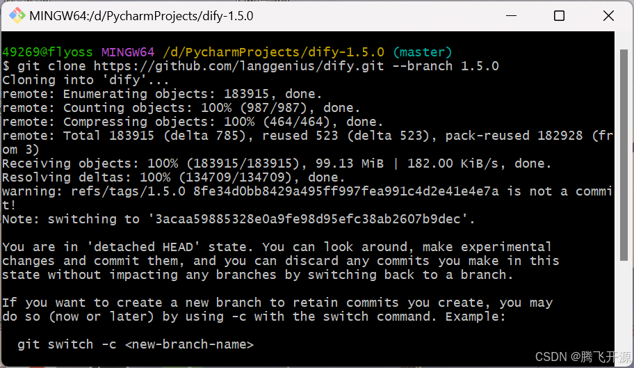 # --branch 1.5.0:通常用于获取某个特定版本的代码,1.5.0 实际上是一个版本标签(tag),不是传统意义上的分支