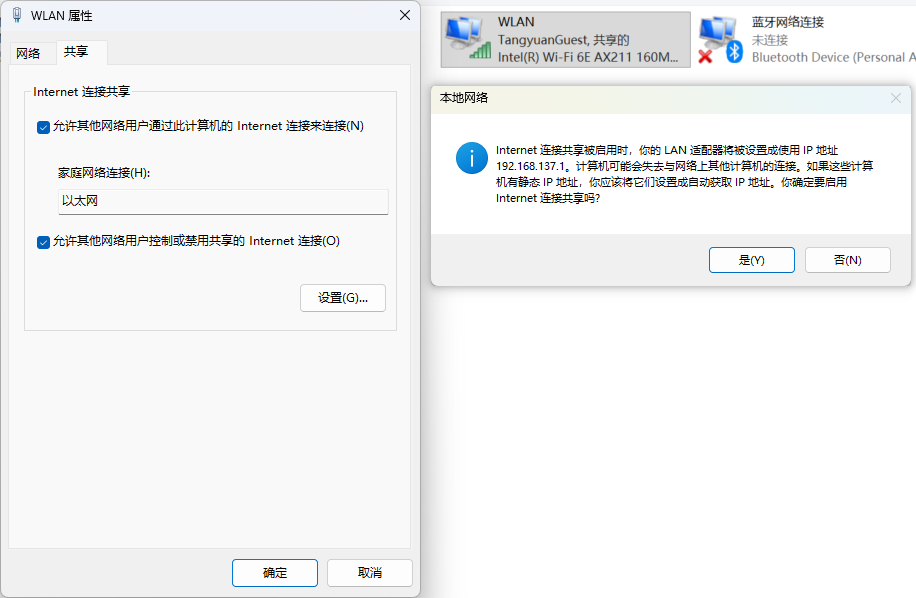 前提条件是:必须先在 Windows 上开启"网络共享",否则板子这边配置好了也上不了网。