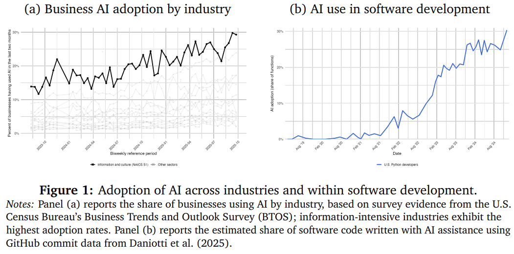 ● 校准与定量化:小论文用可观测参数校准模型(例如软件份额 β≈1/3、质量异质性 γ≈3、包替代性 σ≈1.5、使用模式替代性 θ≈3--4),并用经验证据(如 Stack Overflow 与 Tailwind 的参与/流量趋势、GitHub 上 AI 生成代码的普及)来约束模型冲击强度与用户对 AI 能力的响应度。